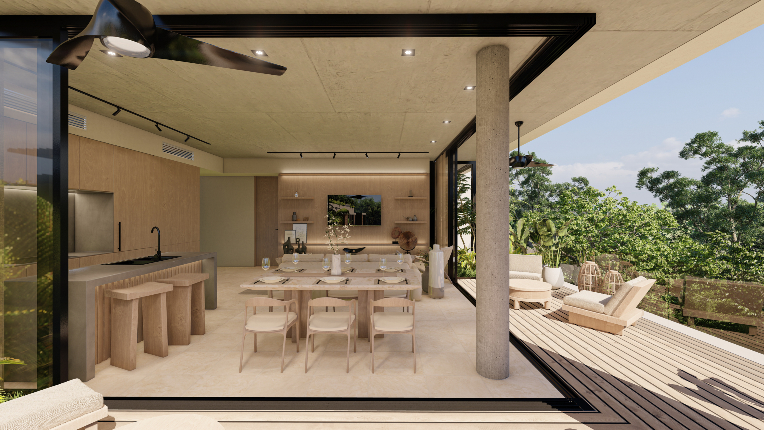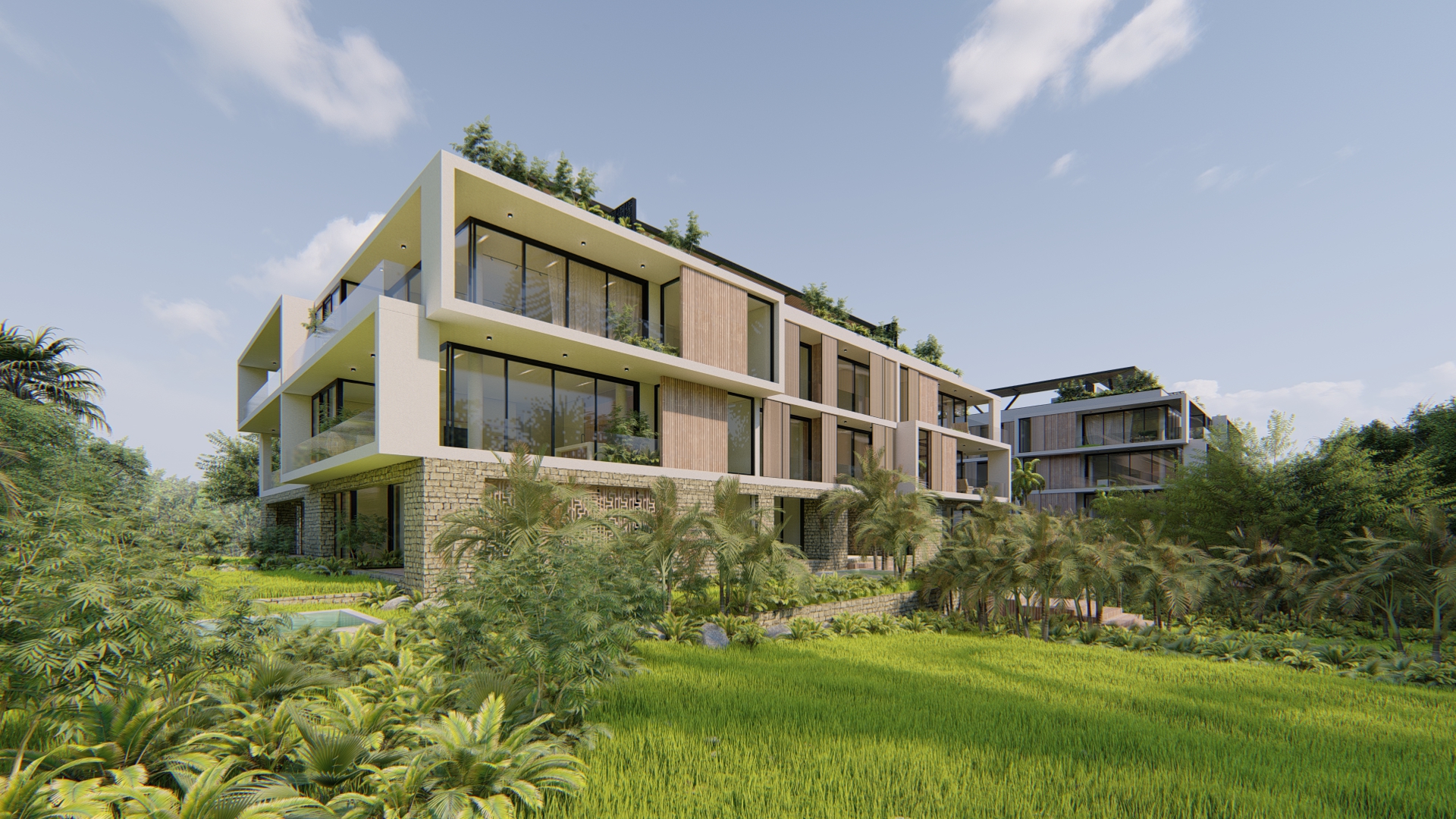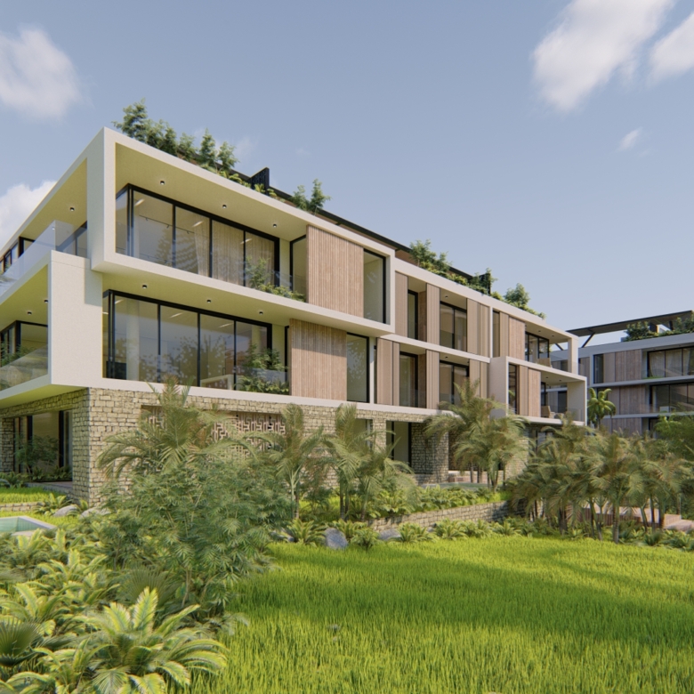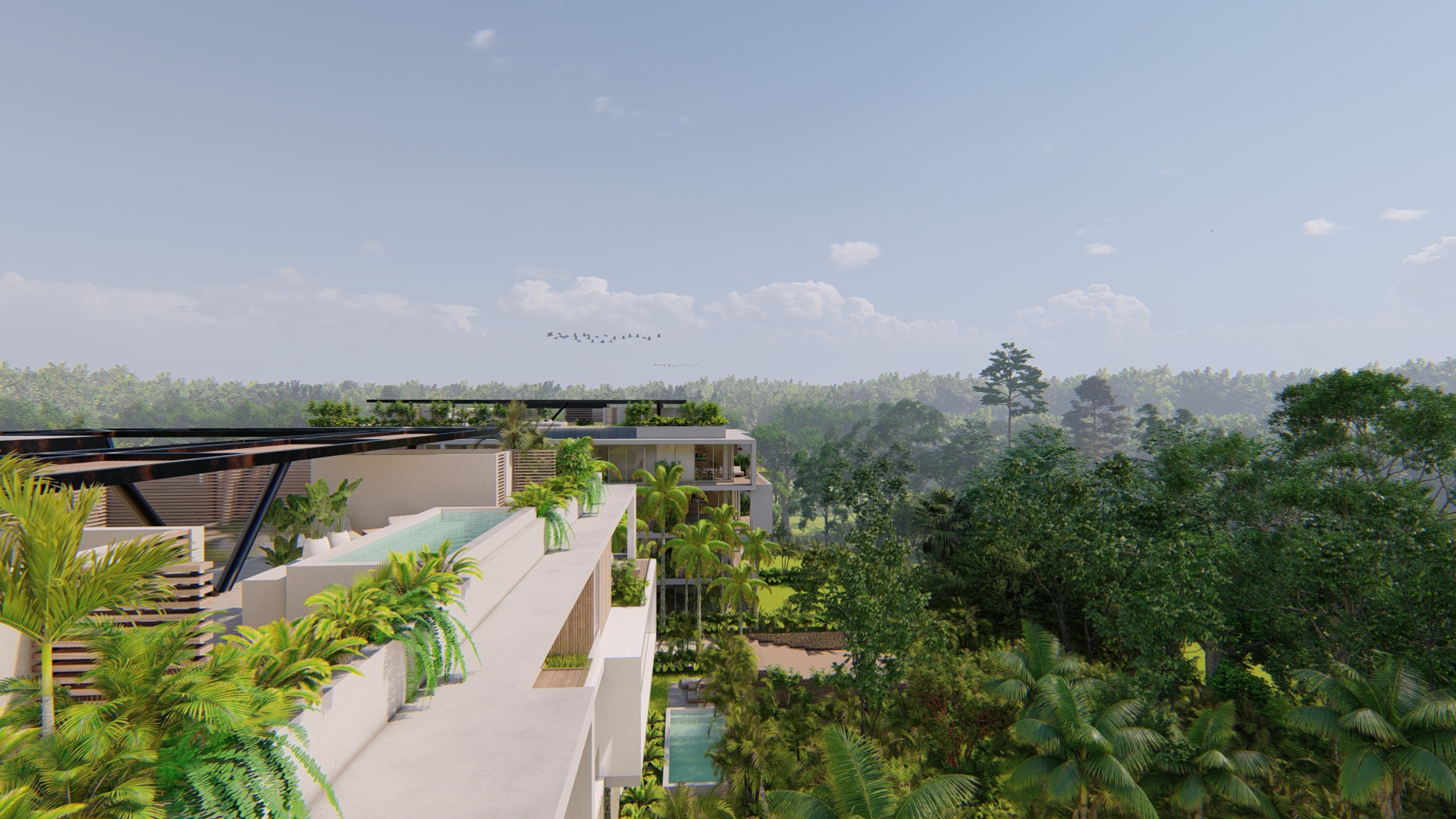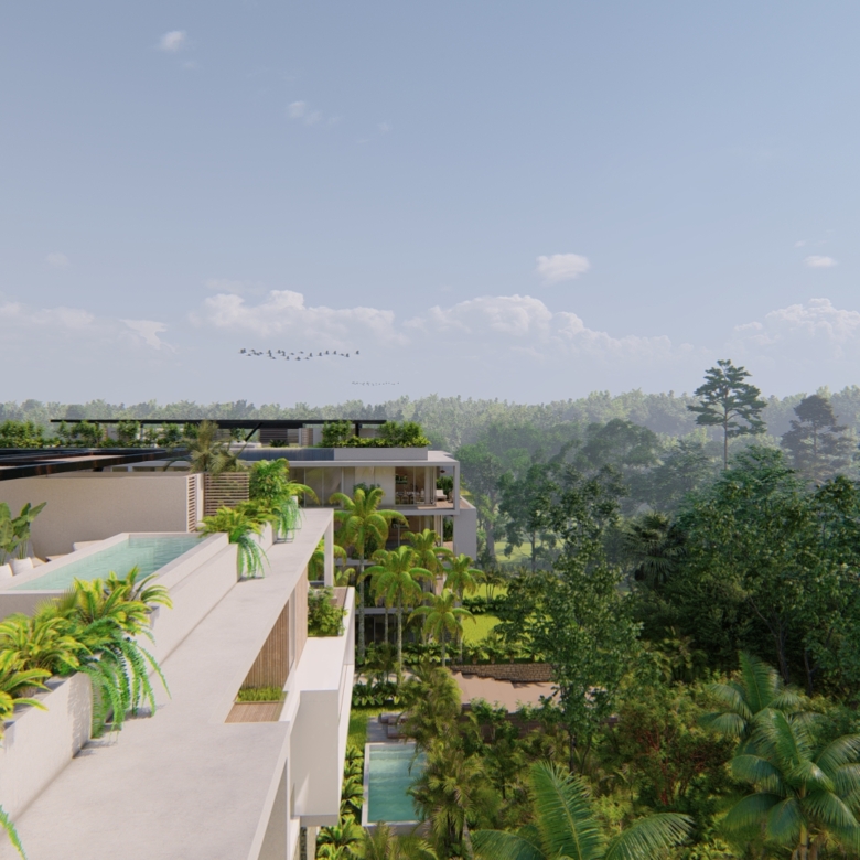 El desarrollo integra departamentos tipo garden con amplios jardines y alberca privada, unidades en niveles intermedios con terrazas y penthouses con rooftop privado que incluye jacuzzi y medio baño. El diseño arquitectónico es contemporáneo, con énfasis en privacidad, ventilación cruzada, iluminación natural y relación directa con áreas verdes.