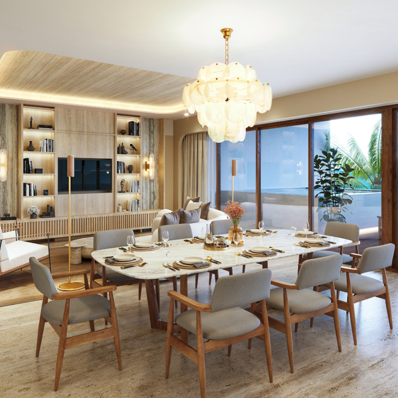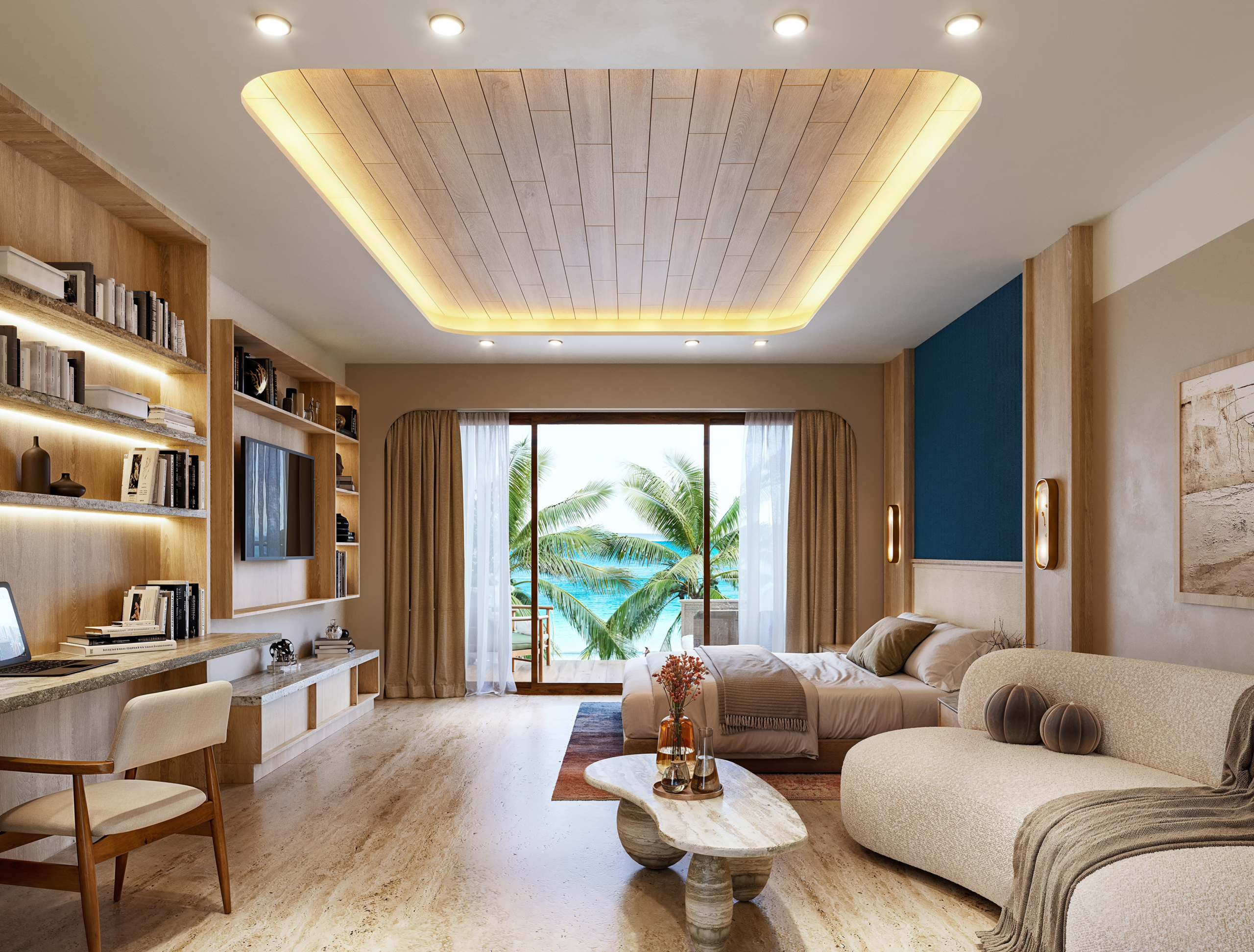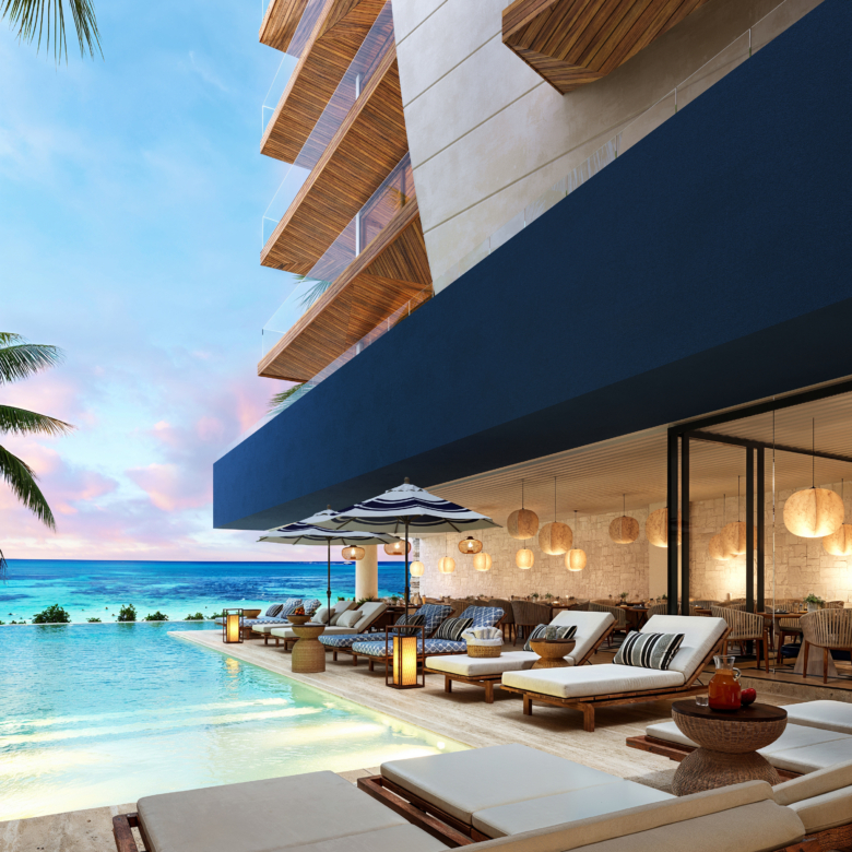 La propuesta arquitectónica prioriza la integración con el entorno natural. Los interiores se abren hacia el exterior mediante ventanales de piso a techo, ventilación cruzada y espacios que permiten disfrutar del mar como parte de la experiencia cotidiana. Las amenidades refuerzan el concepto de lujo frente al mar con alberca infinity oceanfront, rooftop con bar panorámico, gimnasio, concierge y espacios de trabajo, creando un entorno ideal para residentes y visitantes de alto perfil.