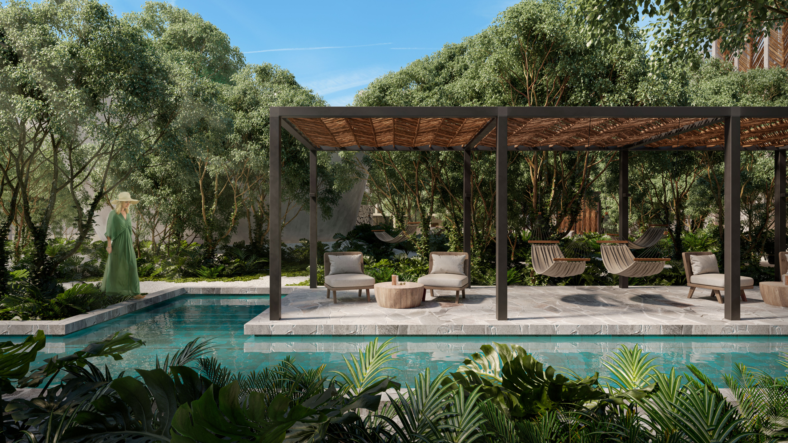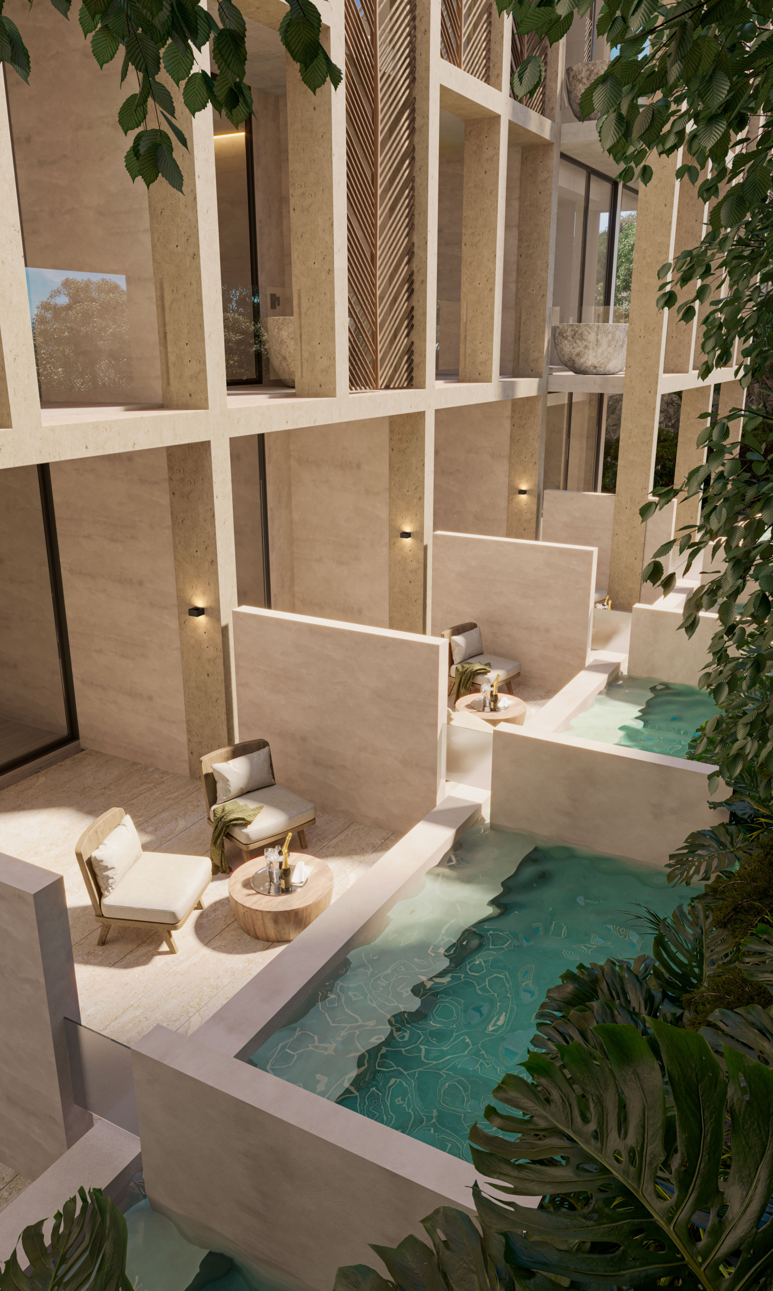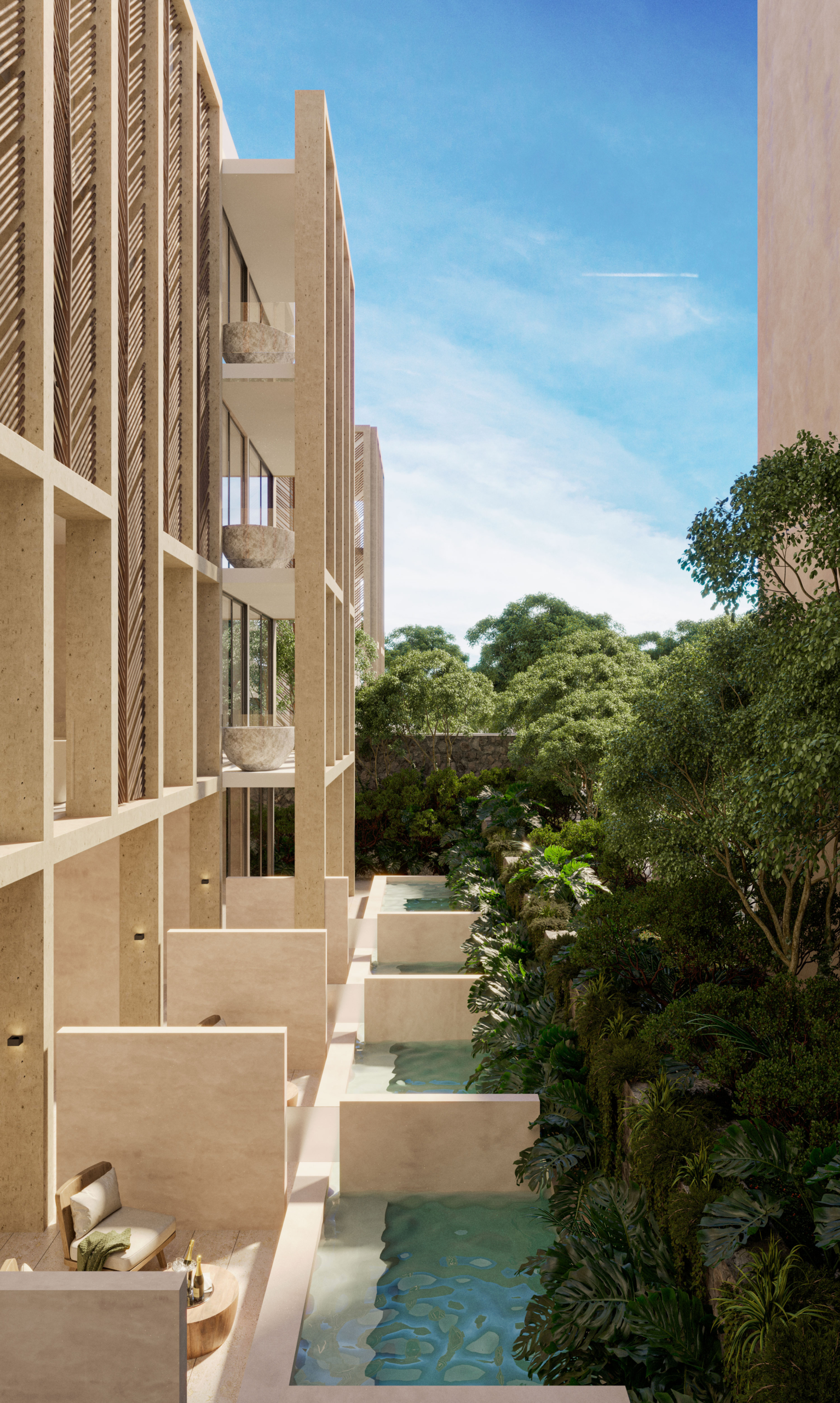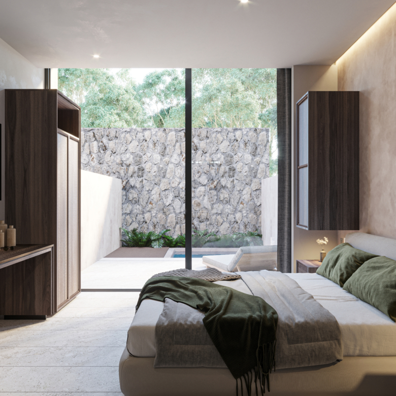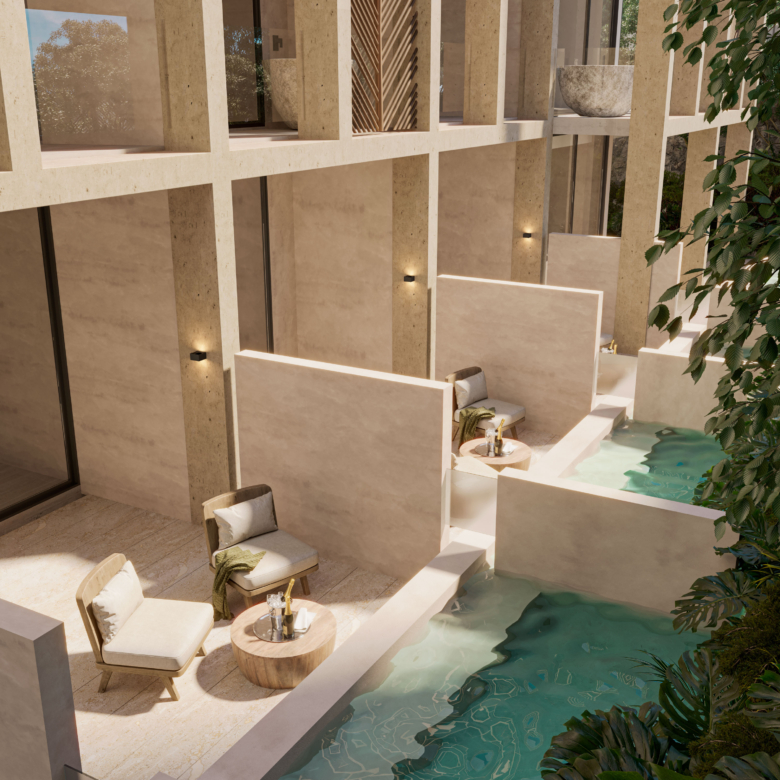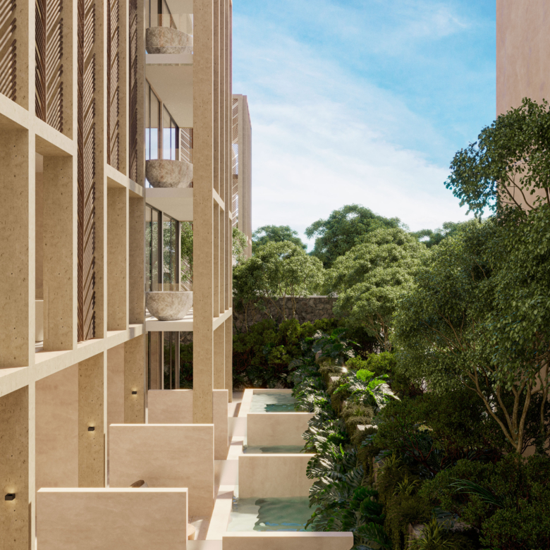 El proyecto está conformado por estudios y departamentos de una y tres recámaras con superficies desde 41 m² hasta 96 m², diseñados para ofrecer iluminación natural, ventilación cruzada y terrazas privadas que se integran con la selva circundante. La arquitectura prioriza materiales de inspiración natural, integración vegetal y espacios que fomentan el equilibrio entre vida residencial y rentabilidad en renta a mediano y largo plazo.