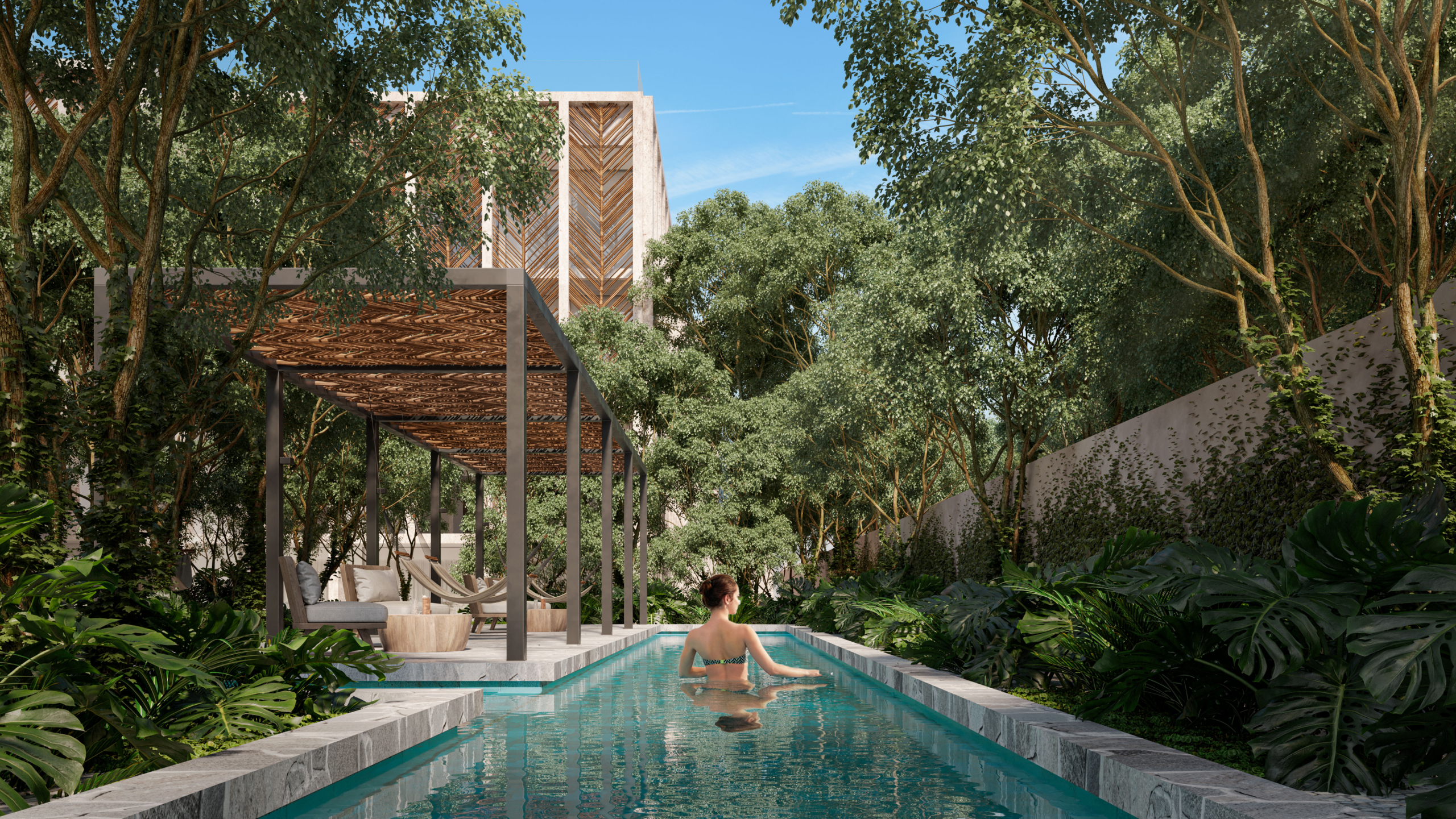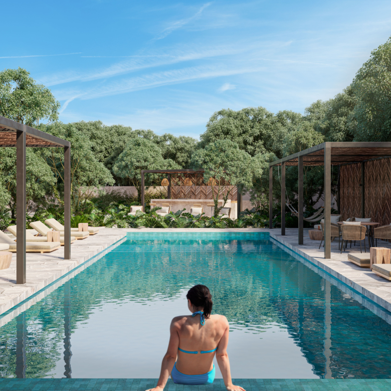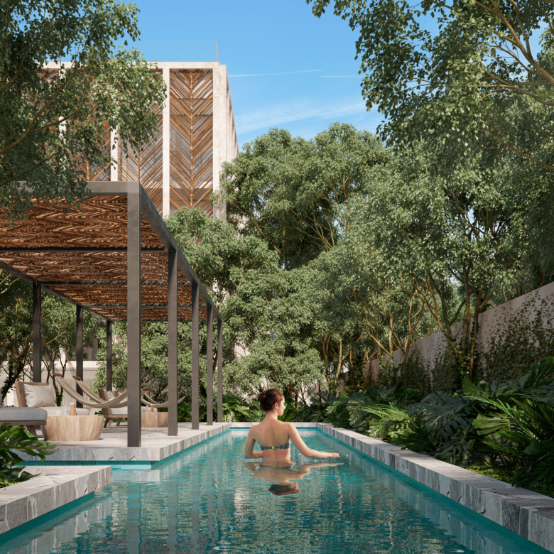 Las amenidades están pensadas para elevar la experiencia del residente y del huésped. El desarrollo cuenta con albercas, carril de nado, spa, gimnasio, áreas verdes, yoga lounge, lobby con concierge, seguridad, estacionamiento y espacios enfocados en el bienestar. Estas características fortalecen su atractivo para quienes buscan propiedades residenciales en Tulum con potencial de renta y uso personal.